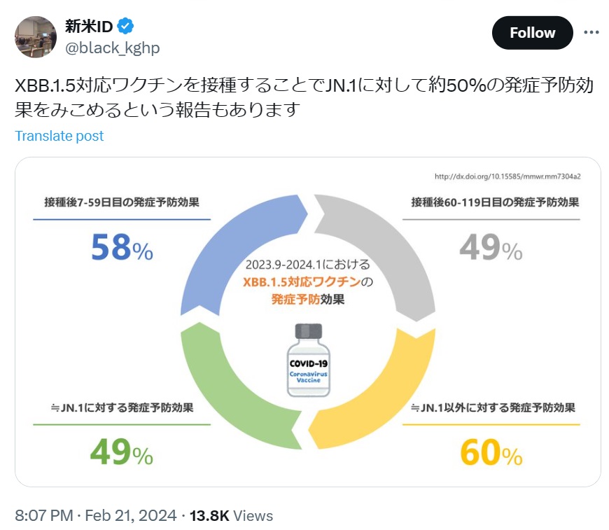XBB.1.5対応ワクチンを接種することでJN.1に対して約50%の発症予防効果をみこめるという報告もあります pic.twitter.com/78InppVDBC