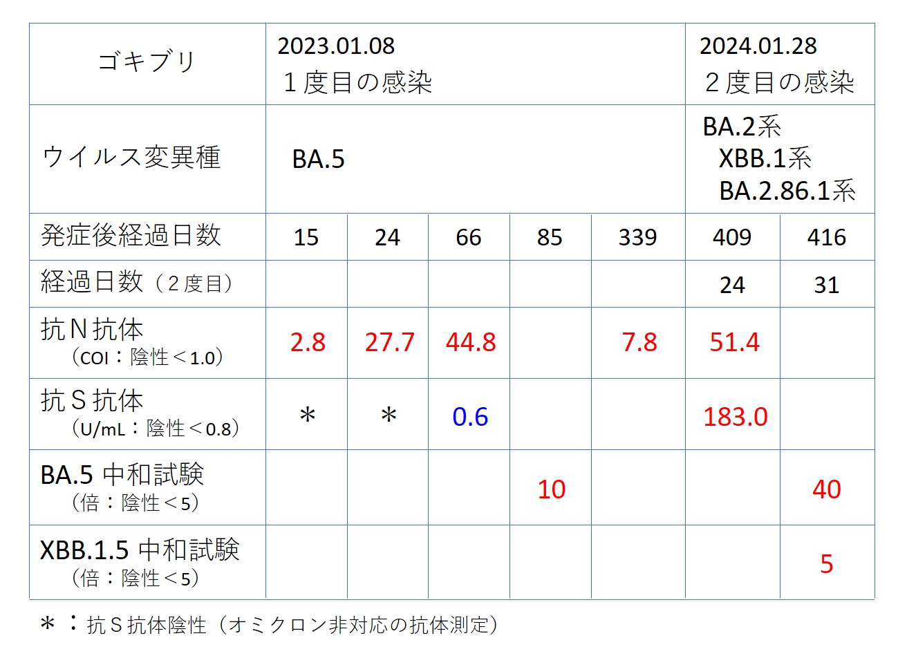1度目の感染時、ウイルス中和試験の結果は「BA.5:10倍」であり、発症85日目としては低く、また抗S抗体は産生されていないことを確認していたので、ふだんからゴキブリにはコロナウイルスの種類を問わず「10倍前後(5倍~10倍~20倍)」の中和能力(感染で出来る抗S抗体に拠らない中和能力)があるのだろうと考えていました。