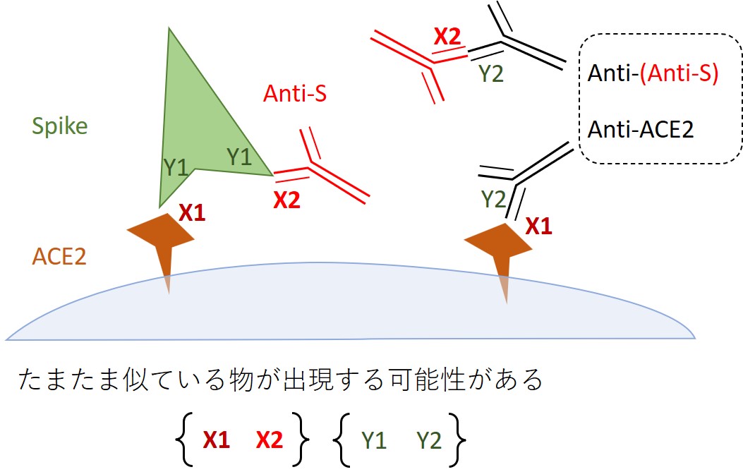 このような「抗ACE2抗体=抗抗S抗体」の存在はウイルス中和試験だけでなく、 Roche の検査キット「Elecsys Anti-SARS-CoV-2 S RUO」にも悪影響を与えるはずです(化学反応の背景に拡がるノイズのようなもの)。