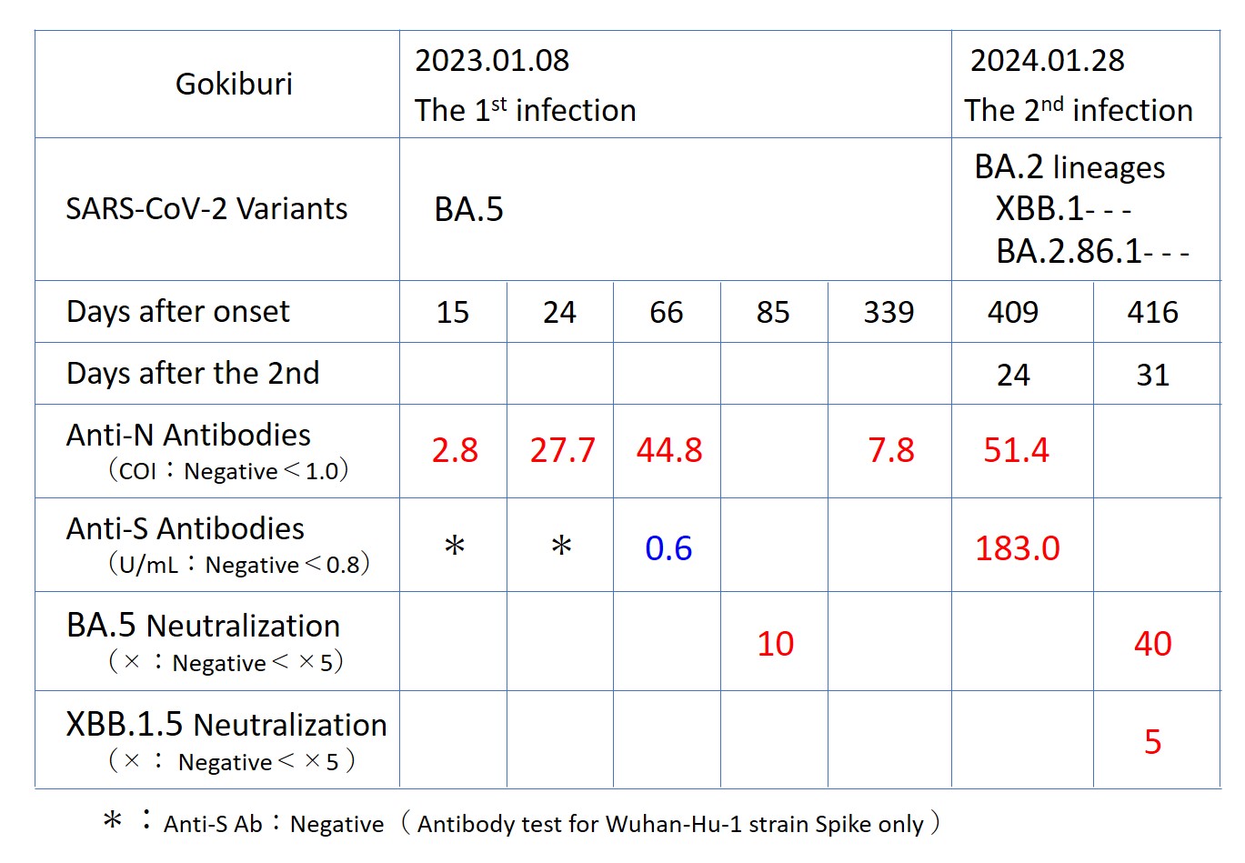 抗体検査の結果とウイルス中和試験の結果を合わせて検討すると、今回ゴキが産生した抗S抗体は、2度目に感染したオミクロン変異種(BA.2系の変異種)のスパイクに対する抗S抗体ではなく、1年前最初に感染したオミクロン「BA.5」に対する抗S抗体だと考えられたのです。