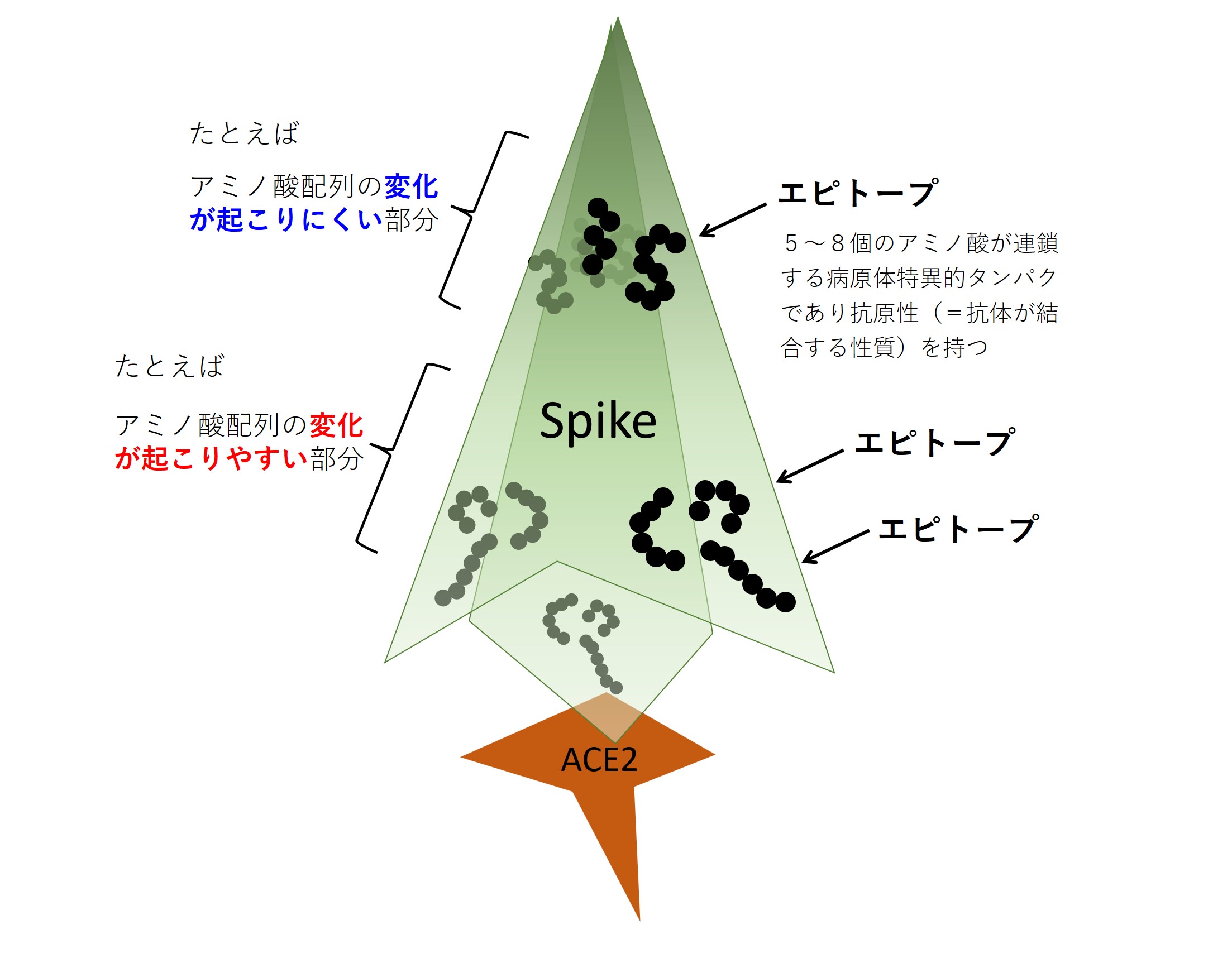 スパイクのあちらこちらにエピトープ(Epitope)があります。