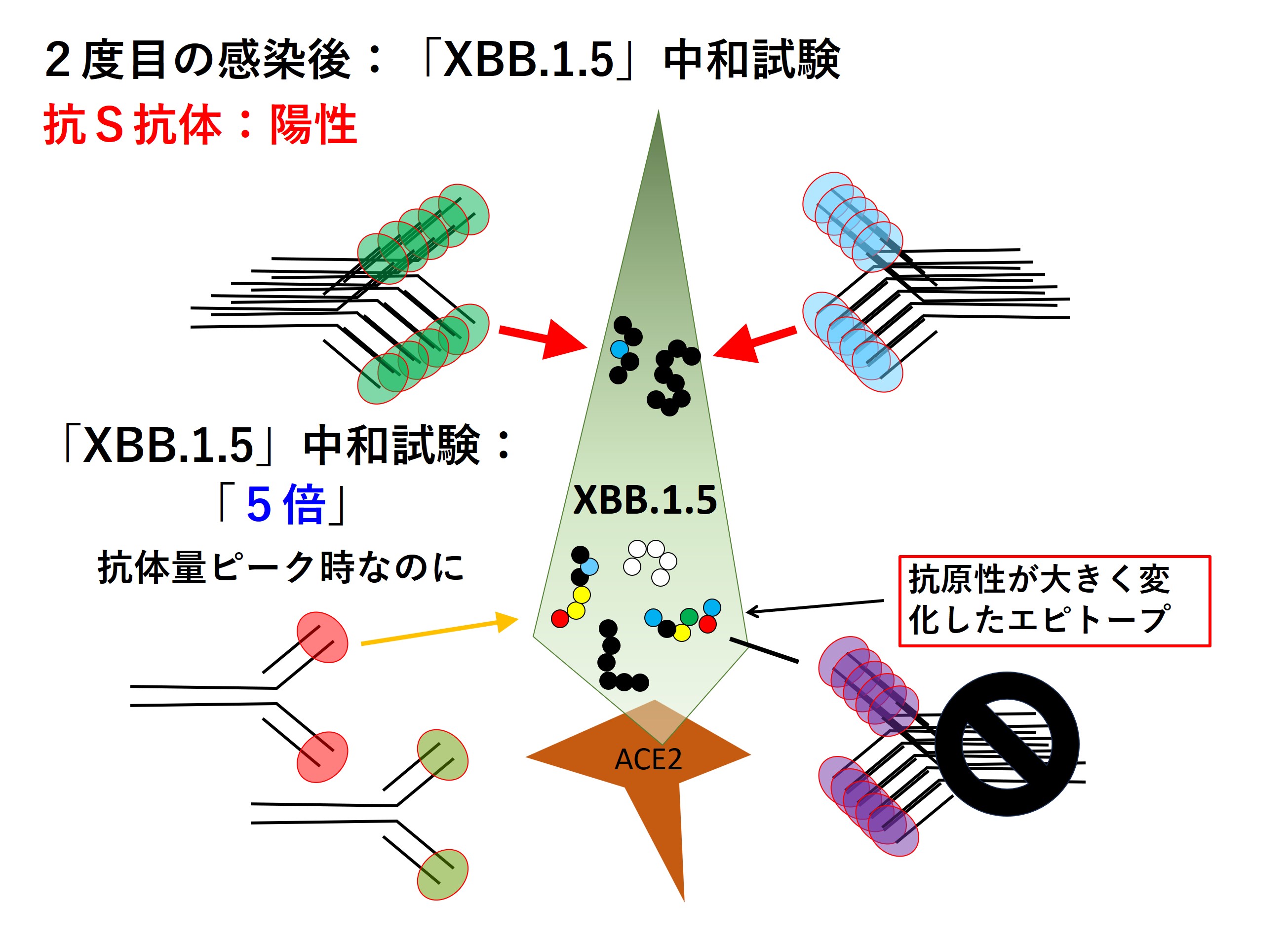 感染したことのない「XBB.1.5」のエピトープに結合する抗体の種類はさらに少なく、「XBB.1.5」に対する中和試験は「5倍」にとどまりました。