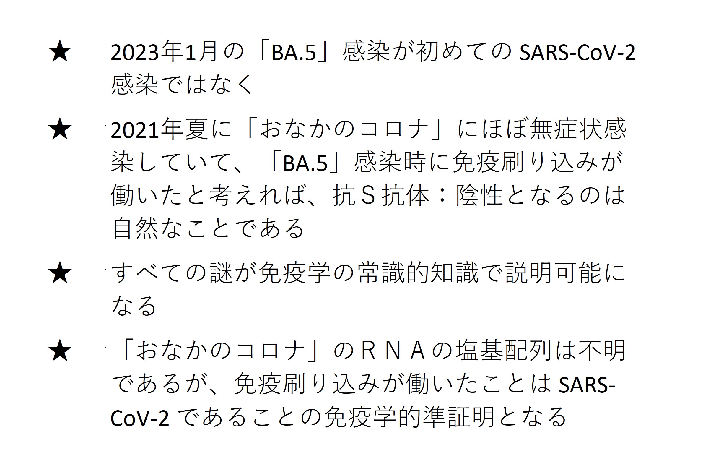 「おなかのコロナ(湘南コロナ)」に感染した後に「BA.5」の感染で免疫刷り込みが出現したということは、「おなかのコロナ」ウイルスが紛れもなく SARS-CoV-2 そのものであることの(弱くもなく、強くもない、でもかなり有力な)証拠であると言うことができます。