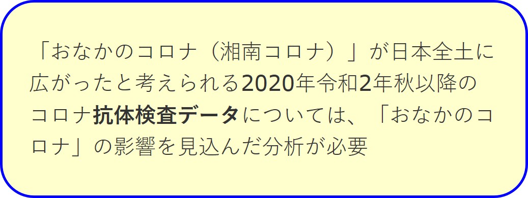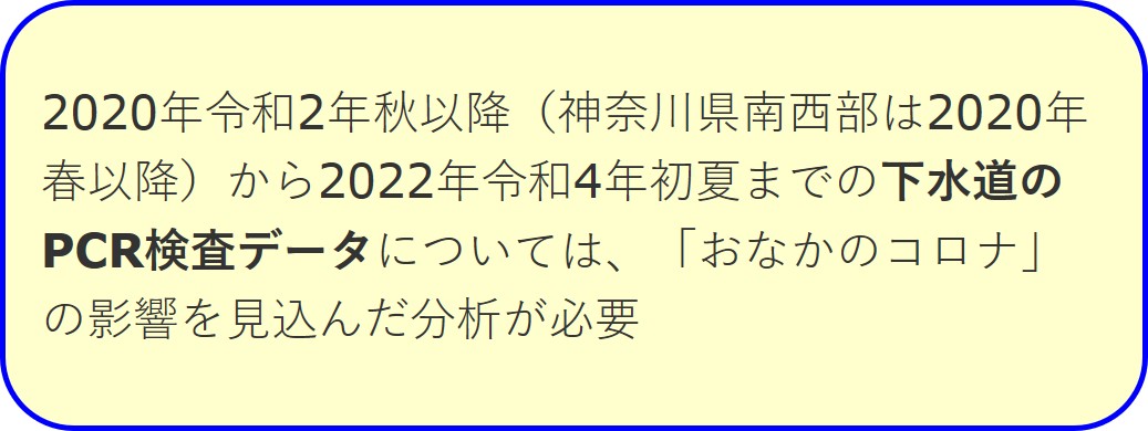 特に「おなかのコロナ」が全国に広がったと考えられる 2020年令和2年秋以降のコロナ抗体検査、2020年令和2年秋以降(神奈川県南西部については 2020年春以降)から 2022年令和4年初夏までの下水道のデータについては、「おなかのコロナ」の影響を見込んだ分析が必要だろうと考えられます。