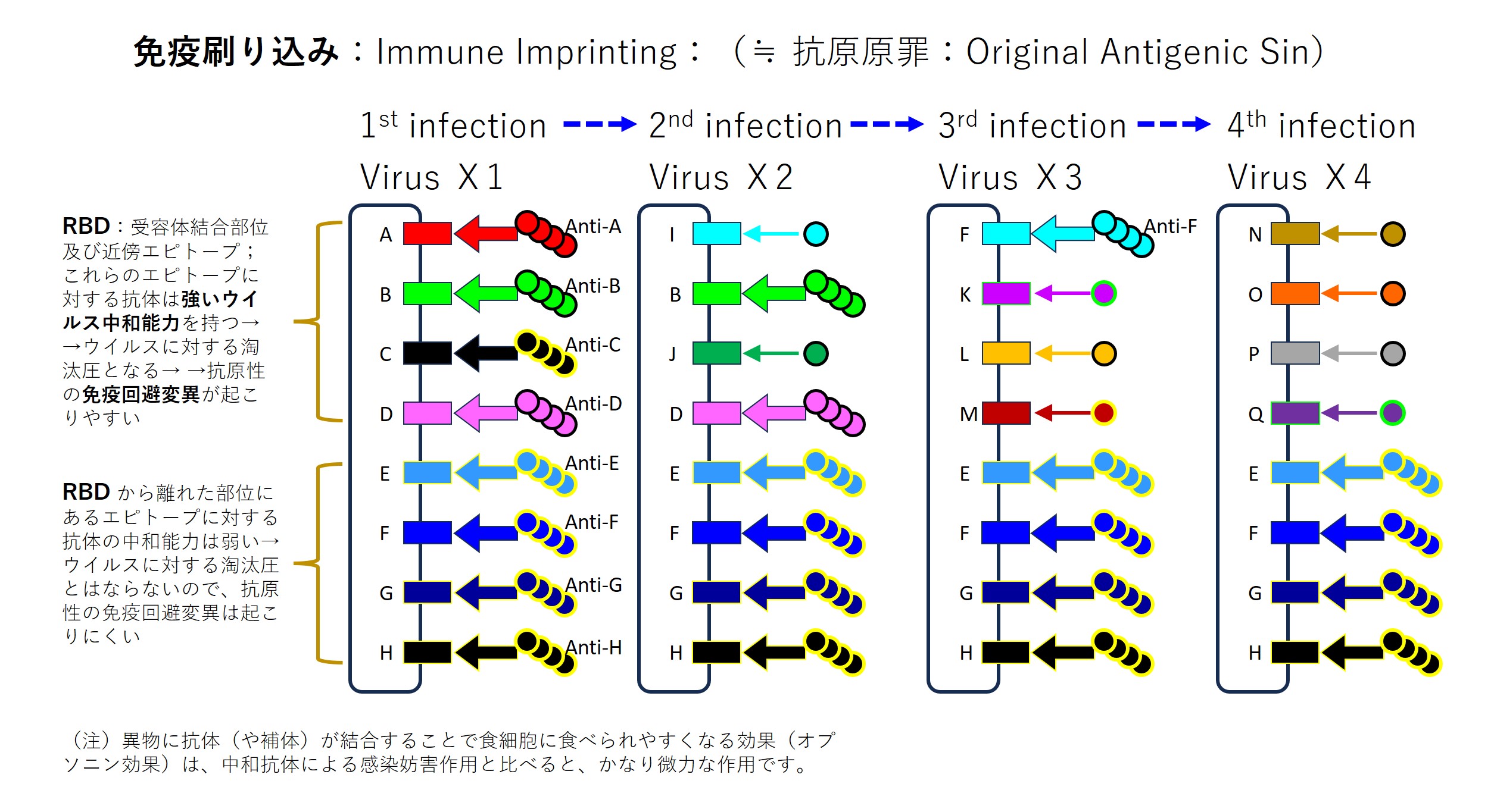 図をよく見れば、感染するたびに免疫刷り込みが起こり、先行感染との共通エピトープと結合する抗体しか産生されなくなる様子を具体的にイメージできると思われます。