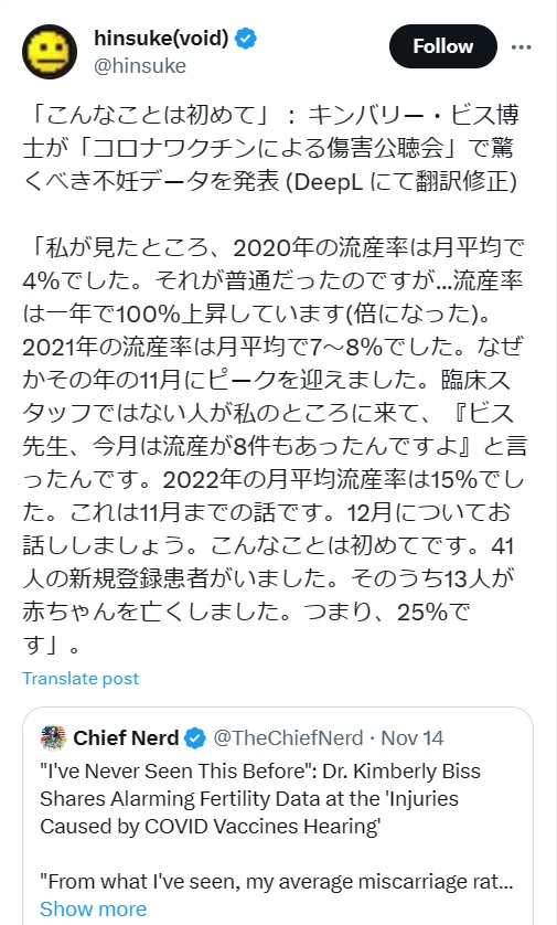 「こんなことは初めて」: キンバリー・ビス博士が「コロナワクチンによる傷害公聴会」で驚くべき不妊データを発表 (DeepL にて翻訳修正)… https://t.co/EaZkQAgEMe