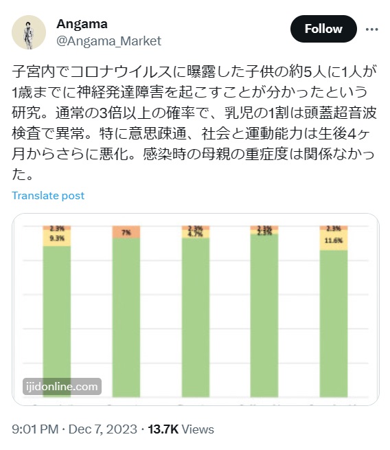 子宮内でコロナウイルスに曝露した子供の約5人に1人が1歳までに神経発達障害を起こすことが分かったという研究。通常の3倍以上の確率で、乳児の1割は頭蓋超音波検査で異常。特に意思疎通、社会と運動能力は生後4ヶ月からさらに悪化。感染時の母親の重症度は関係なかった。https://t.co/dlsUk94oab