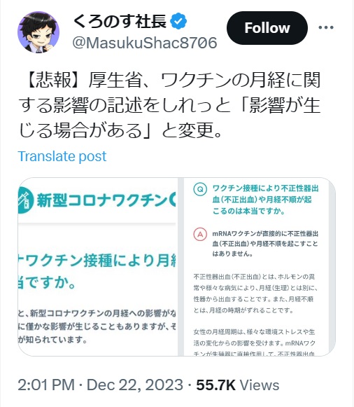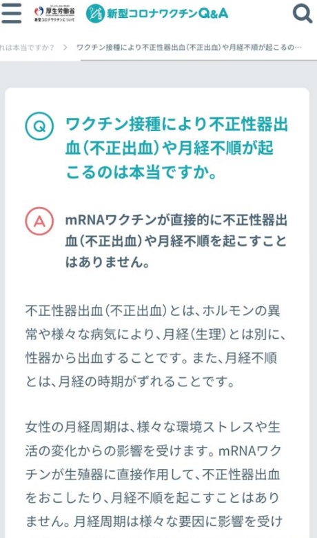 【悲報】厚生省、ワクチンの月経に関する影響の記述をしれっと「影響が生じる場合がある」と変更。 pic.twitter.com/iKBMjL8JlL
