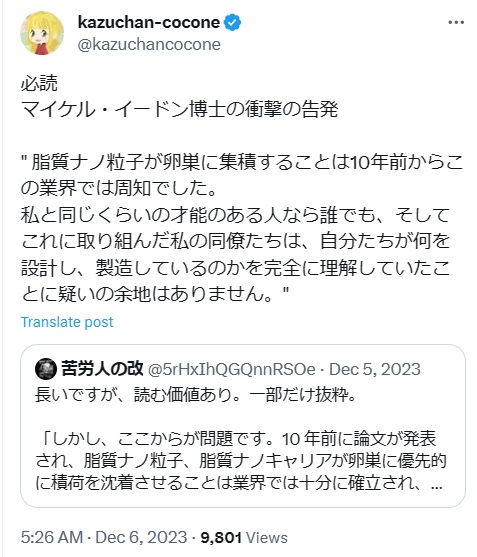 逆に、月経に全く影響の出ない場合は、接種したmRNAワクチンがうまくスパイクを作ることの出来ていない可能性が疑われます。コロナウイルスのスパイクを作るmRNAワクチンとしては「欠陥品」ということになります。