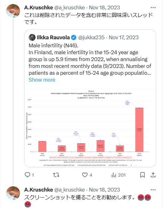 フィンランド保健局THLはデータベースから情報を削除し始めたようだ。 オープンデータベースの最新バージョン(2023年11月11日)では、男性不妊症(N46)に関連するすべての情報が削除されました。