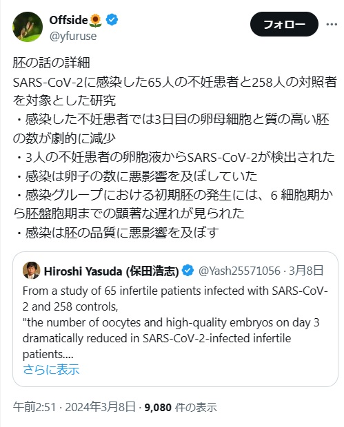 女性の妊娠機能への悪影響は、コロナ感染でも、mRNAワクチン接種でもおこります。