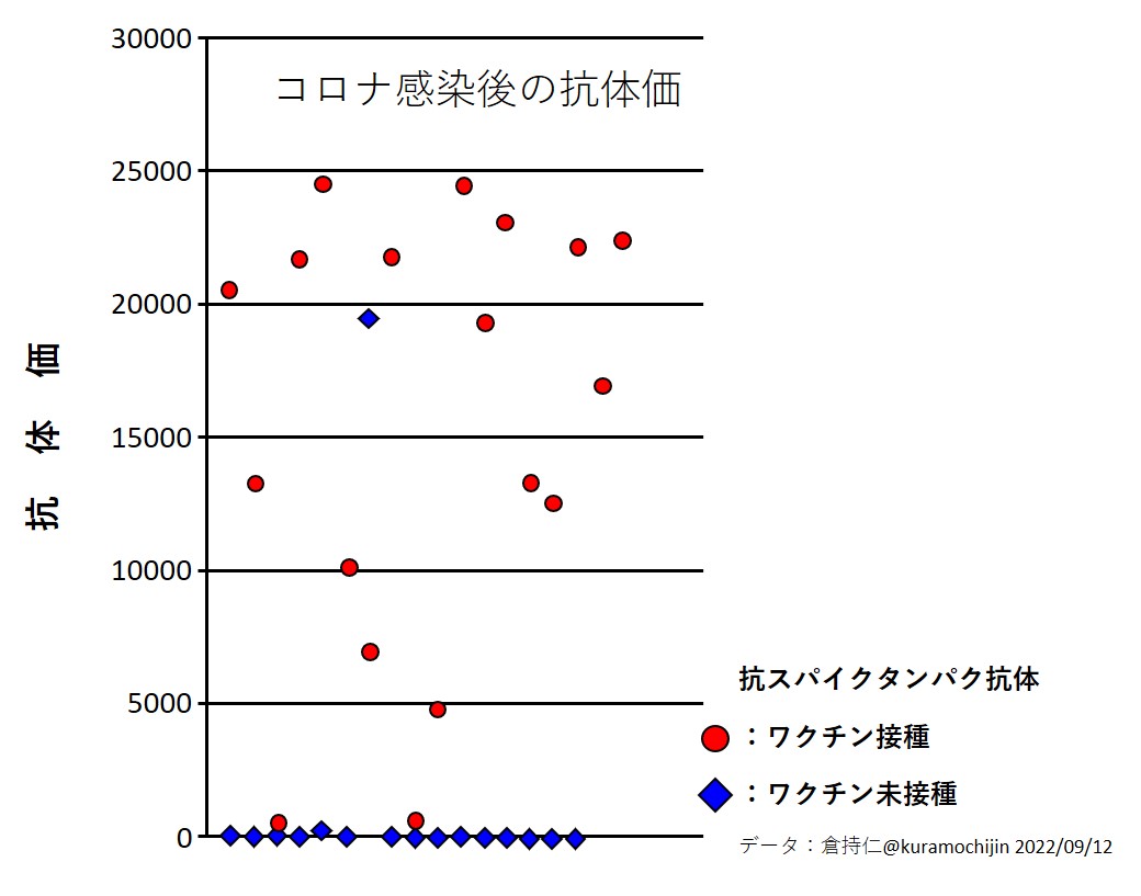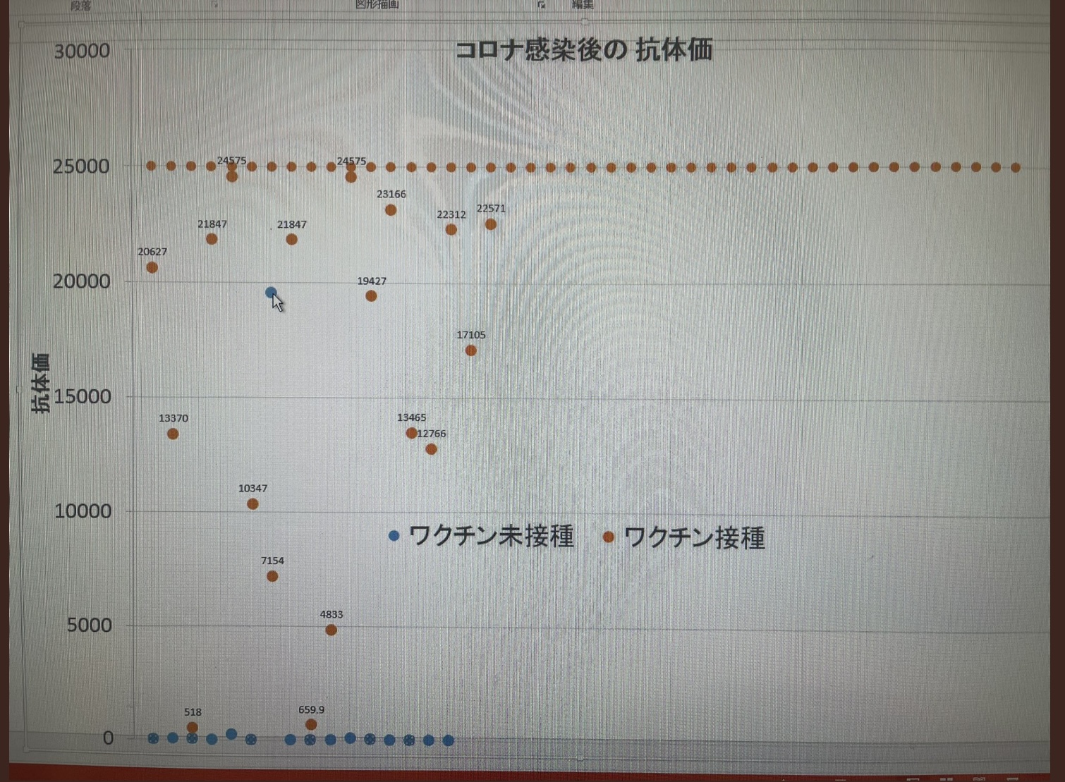 グラフには、未接種なのに抗体がたくさん作られている人がひとりいます。きっと中等症以上の症状だったのでしょう(推測)。こうした抗体産生は数か月から数年以内に止まるようです。ヒトの自然な免疫は、コロナに罹って抗体産生ができるようになってもそれを止め、抗体無しで次のコロナ感染に備えようとします。