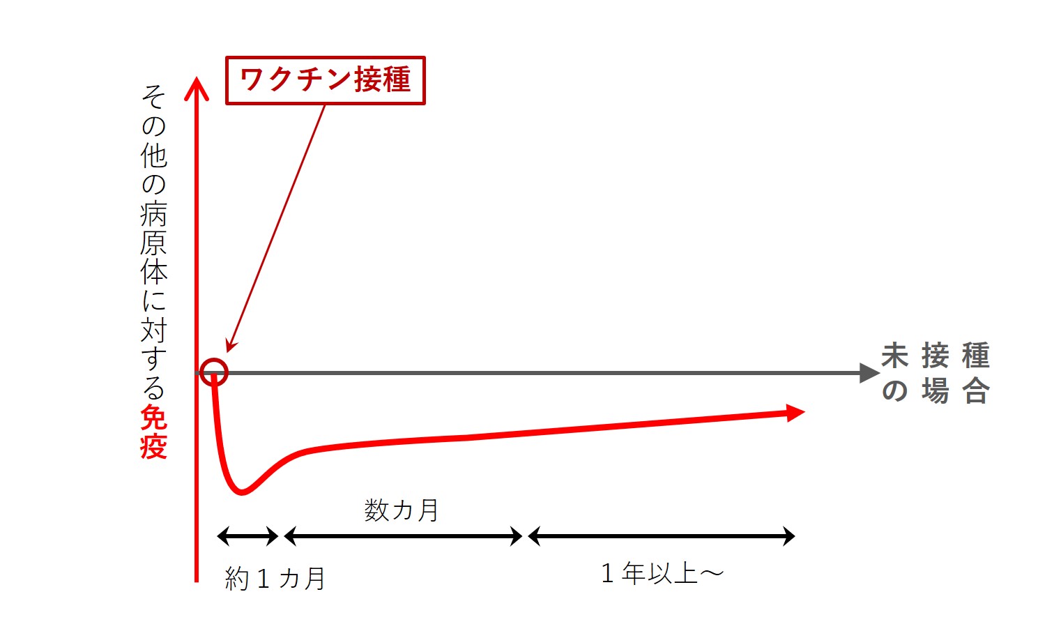 一度でも接種を受けた人は、程度の個人差は大きいのですが、免疫の調子が悪くなり、いろいろな病原体に感染しやすくなっています。