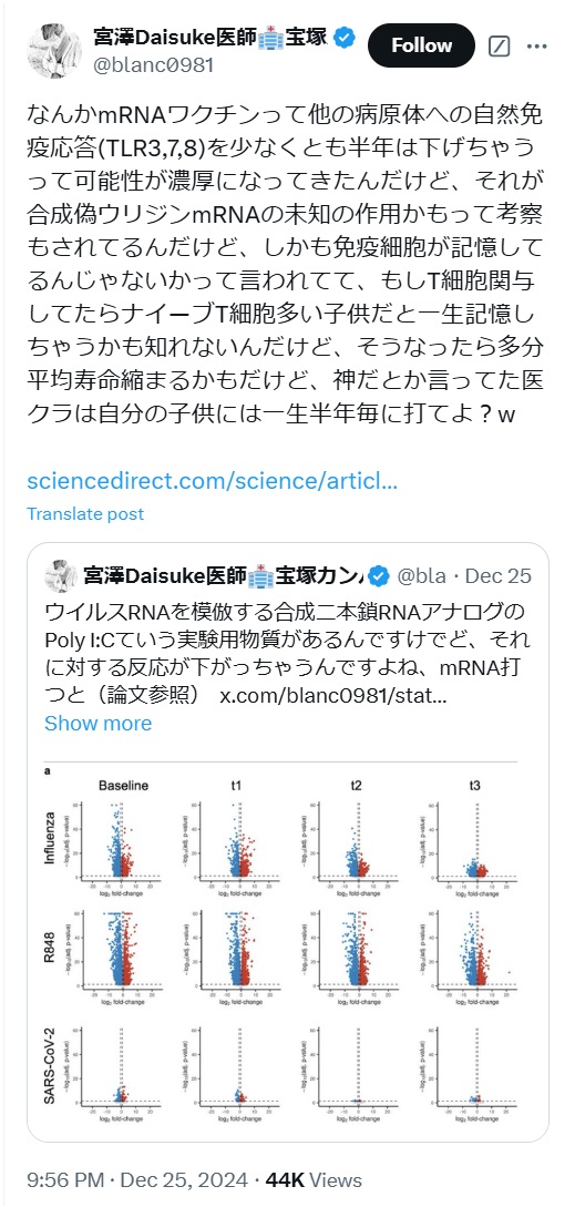 なんかmRNAワクチンって他の病原体への自然免疫応答(TLR3,7,8)を少なくとも半年は下げちゃうって可能性が濃厚になってきたんだけど、それが合成偽ウリジンmRNAの未知の作用かもって考察もされてるんだけど、しかも免疫細胞が記憶してるんじゃないかって言われてて、もしT細胞関与してたらナイーブT細胞… https://t.co/rsvmZ5fHn4