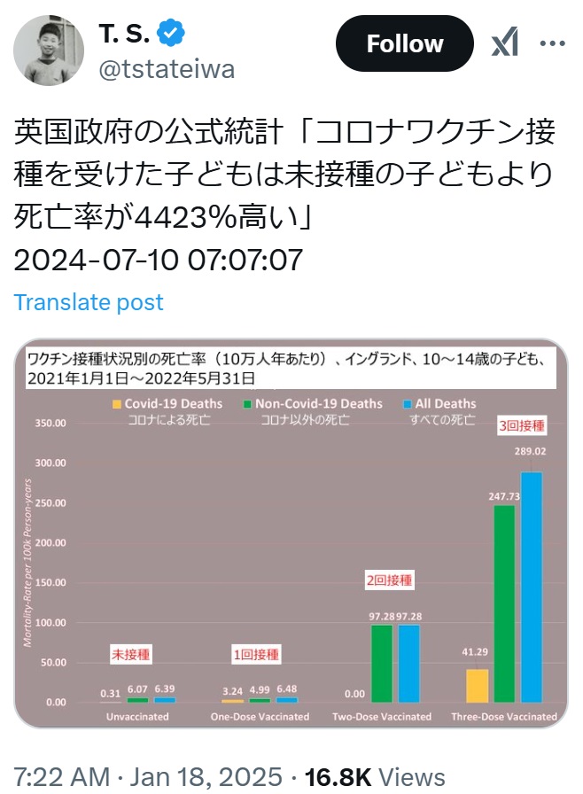 英国政府の公式統計「コロナワクチン接種を受けた子どもは未接種の子どもより死亡率が4423%高い」