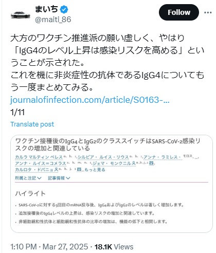 コロナワクチン接種による大量のスパイクタンパクへの曝露は、IgG4を誘導する。