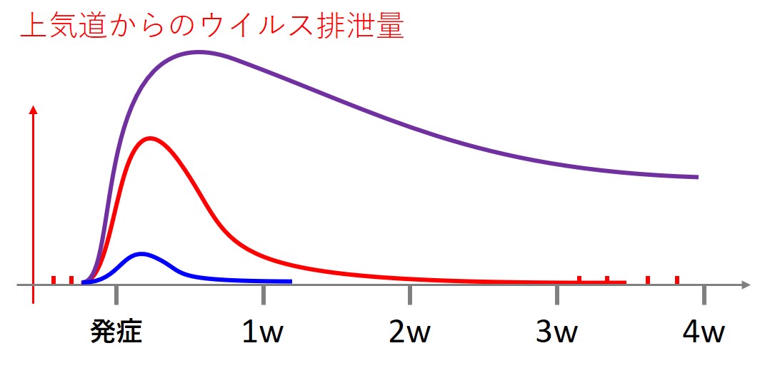 「紫:高くて大きい」は多量のウイルス排出が続く例です。症状が重いとは限りません。無症状もありえます。