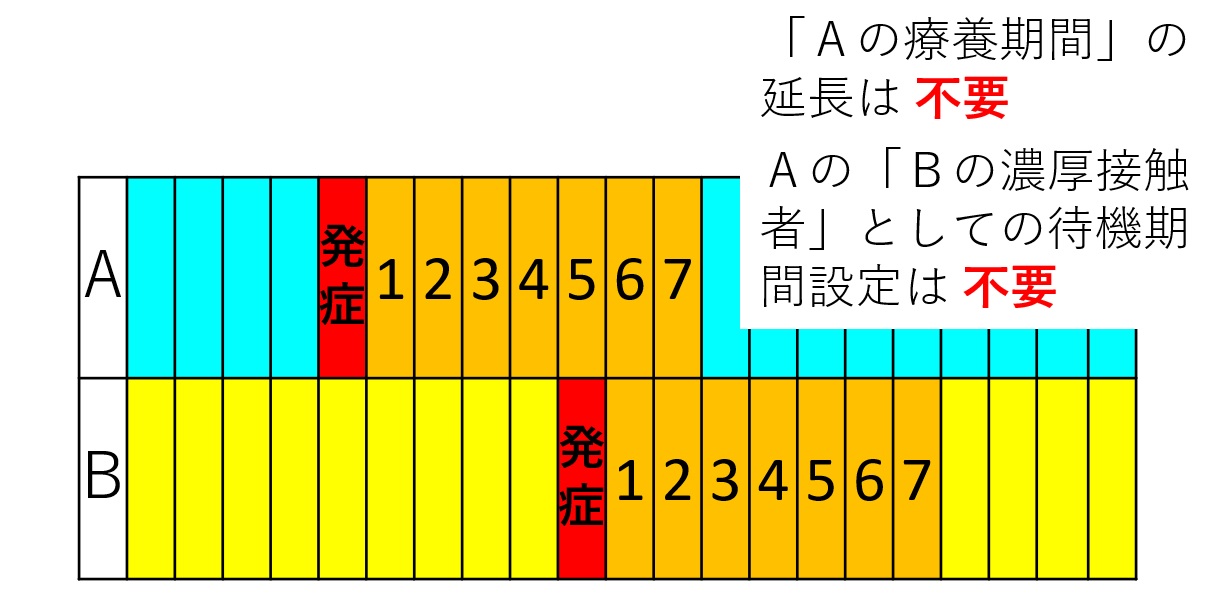 先に発症した 患者A の療養期間中に、あるいは療養期間の少し後に 同居家族B が遅れてコロナの感染発症者(患者B)になった場合、先の 患者A は上気道症状の再燃等(新たな感染症状)が出現しなければ、その療養期間を延長する必要はありません。