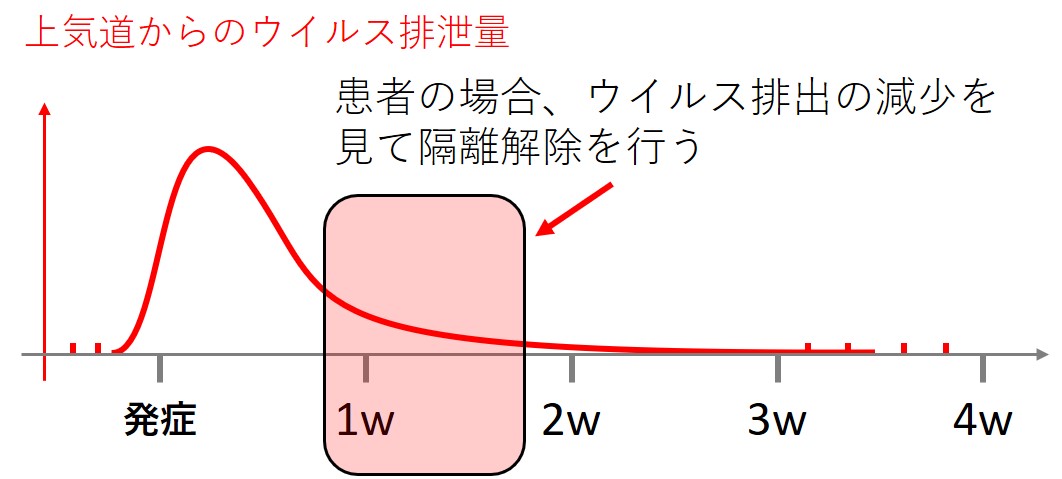 しかし、ウイルスは発症2週間後~4週間後まで(あるいはそれ以降も)上気道から排出され続きます。(下図↓)