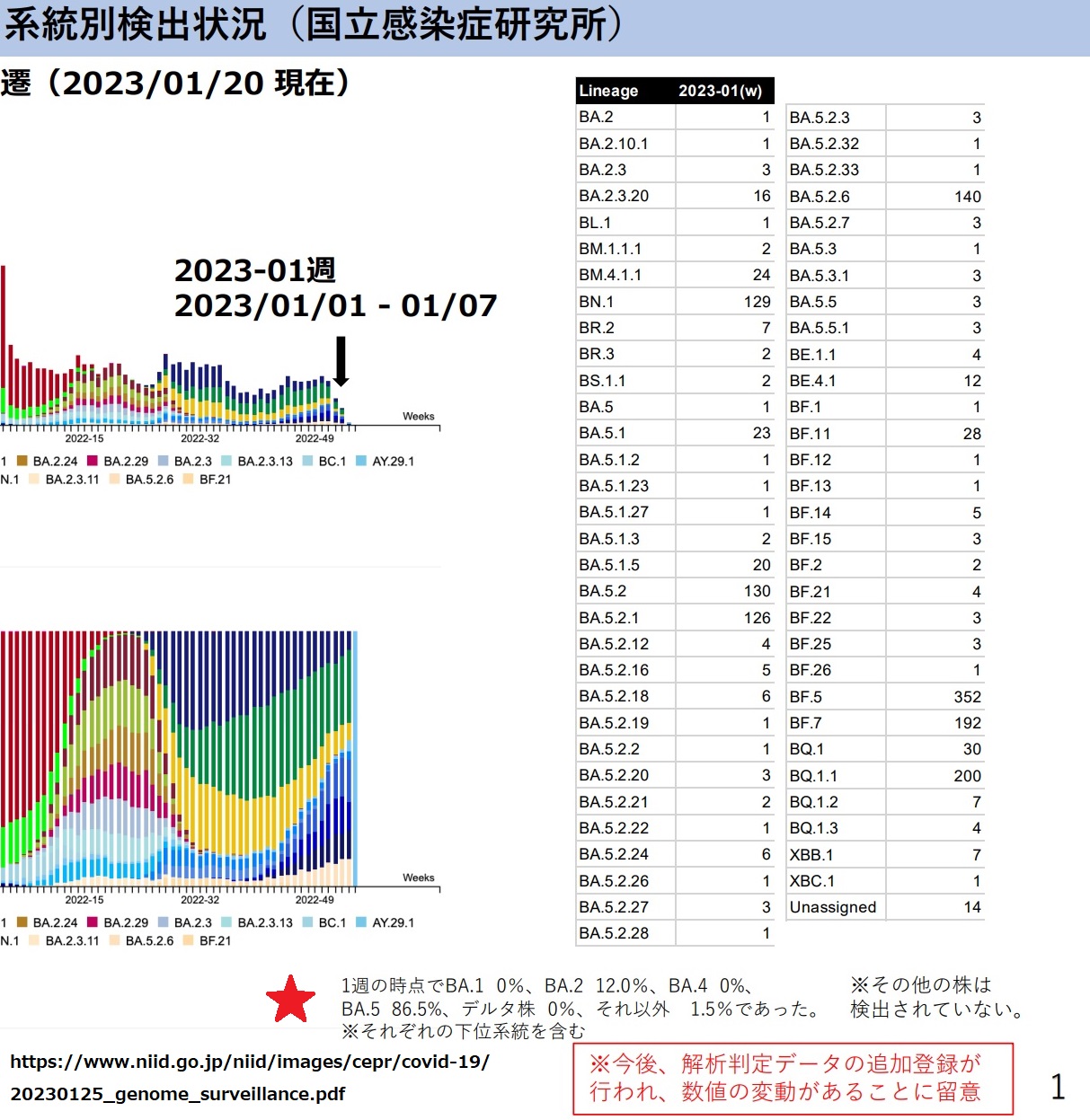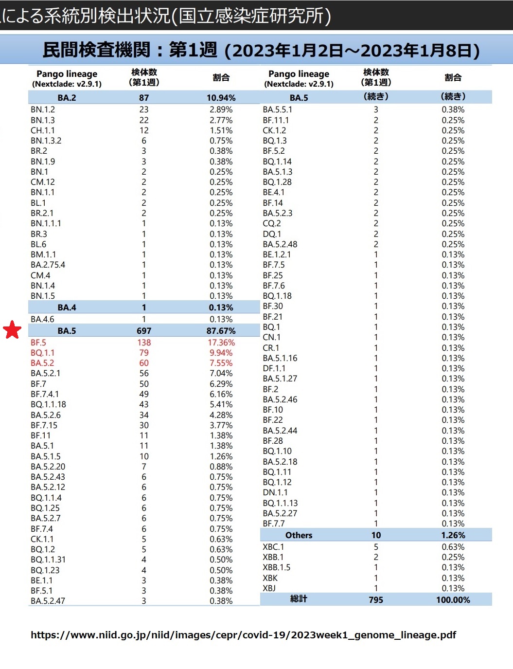 国立感染症研究所が報告した「民間検査機関の検体に基づくゲノムサーベイランスによる系統別検出状況:第1週 (2023年1月2日~2023年1月8日)」でも、日本における変異体の約9割が「BA.5 系」となっています。