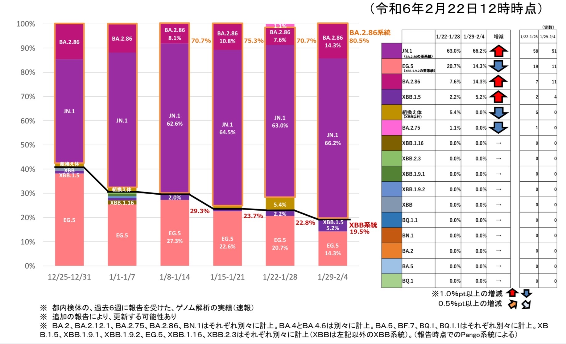 東京都の流行系統:東京都のモニタリング分析資料(令和6年2月22日公表):スライド9枚目:病原体サーベイランス(ゲノム解析)2024年令和6年(1月22日~2月4日)」