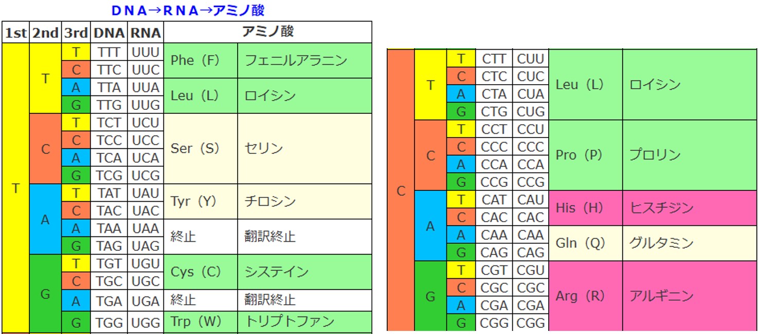 「塩基配列3個の1組」と「アミノ酸1個」が対応しています。この対応表を コドン表 と呼びます。