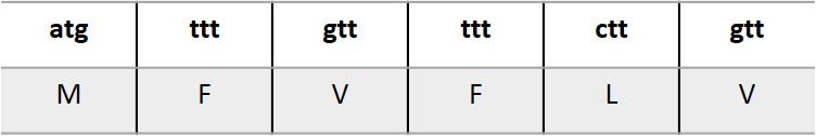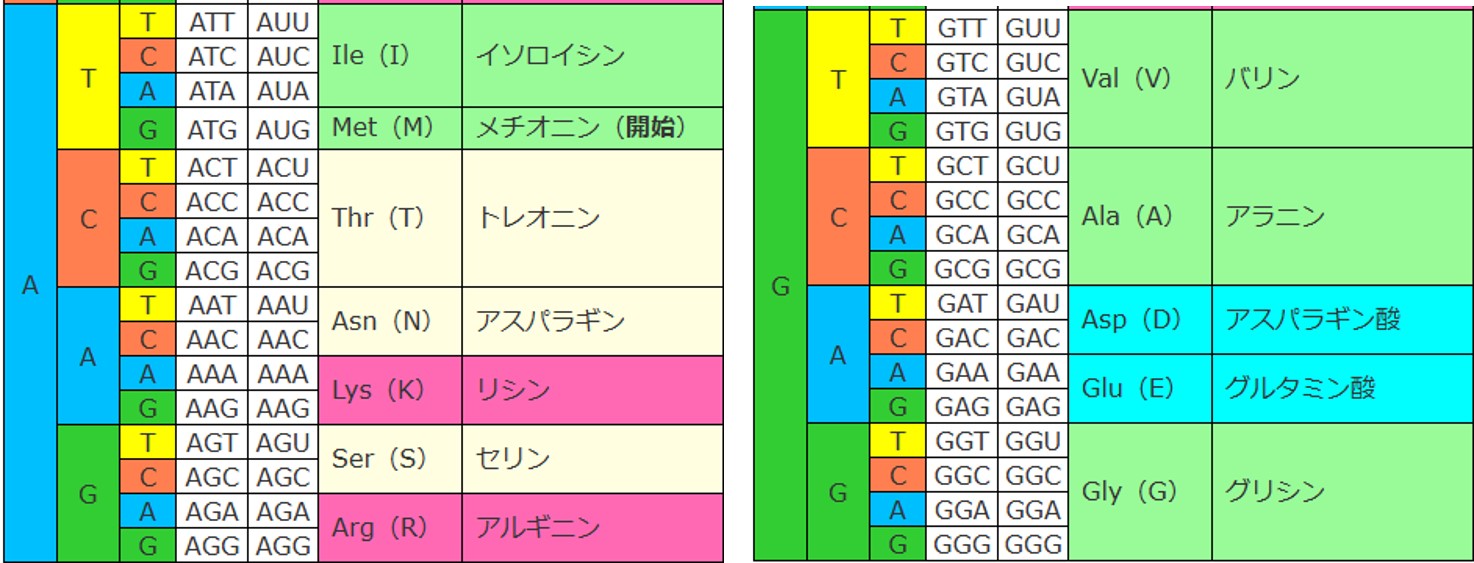 コドン表を使って塩基配列とアミノ酸配列を見比べると、きちんと対応していることがわかります。