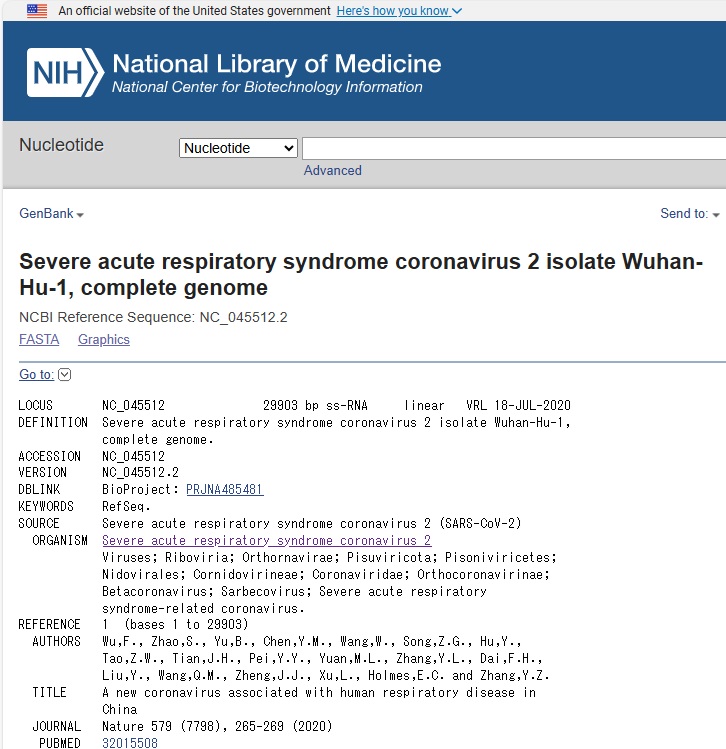 では、実際に武漢株(2020.07.18報告版)のページを見てみましょう:▶ ▶ ▶(Severe acute respiratory syndrome coronavirus 2 isolate Wuhan-Hu-1, complete genome):この武漢株(2020.07.18報告版)が新型コロナウイルス SARS-CoV-2 の変異を見る基準になっているようです。