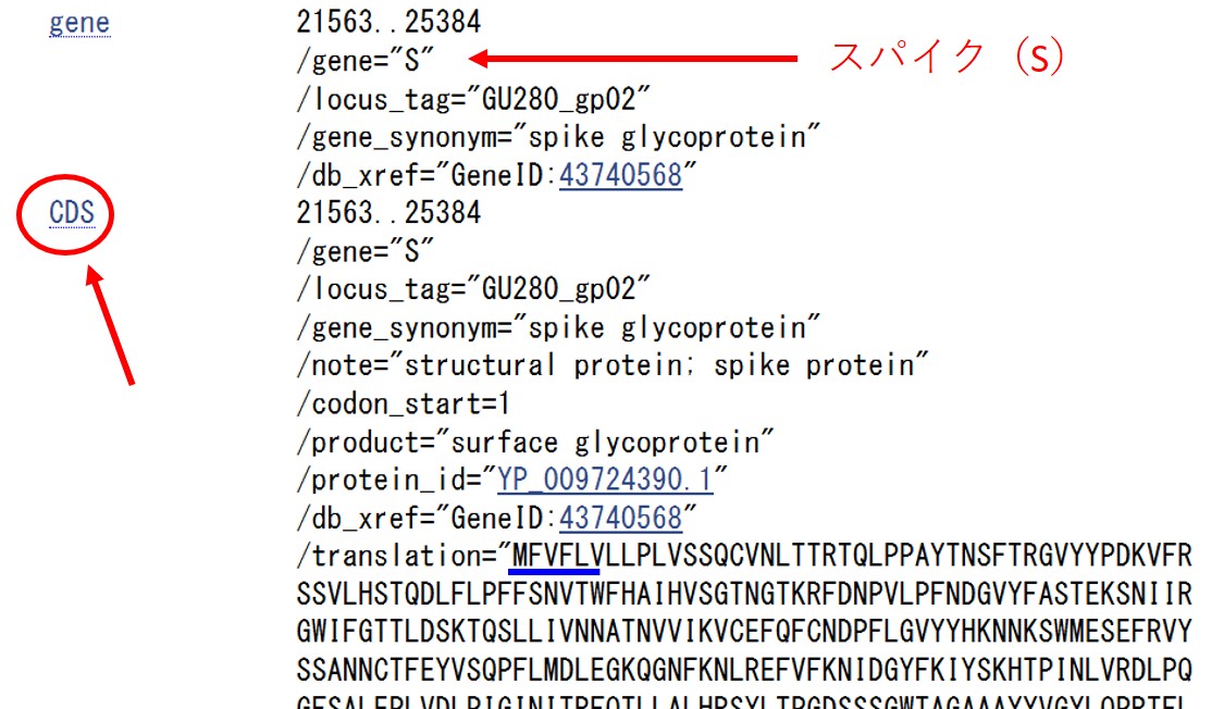 そこにコロナのスパイク(Sタンパク)の配列情報があります。