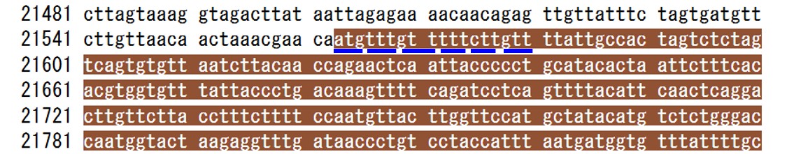 ページの下の方(ページの半分位の位置)に移ると「/gene="S"」と書かれた部分があります。