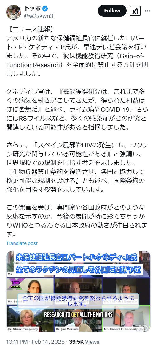アメリカの新たな保健福祉長官に就任したロバート・F・ケネディ・Jr氏が、早速テレビ会議を行いました。その中で、彼は機能獲得研究(Gain-of-Function Research)を全面的に禁止する方針を明言しました。… pic.twitter.com/jQeeWY38ax