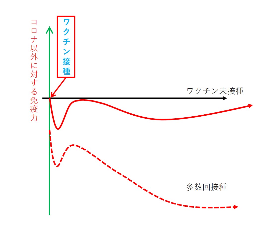 コロナ感染後すぐにワクチン接種を受けたり、同じコロナワクチンの接種を繰り返し受けると、免疫系はコロナに過剰適応してゆき、他の病原体に対する備えが劣化していきます。