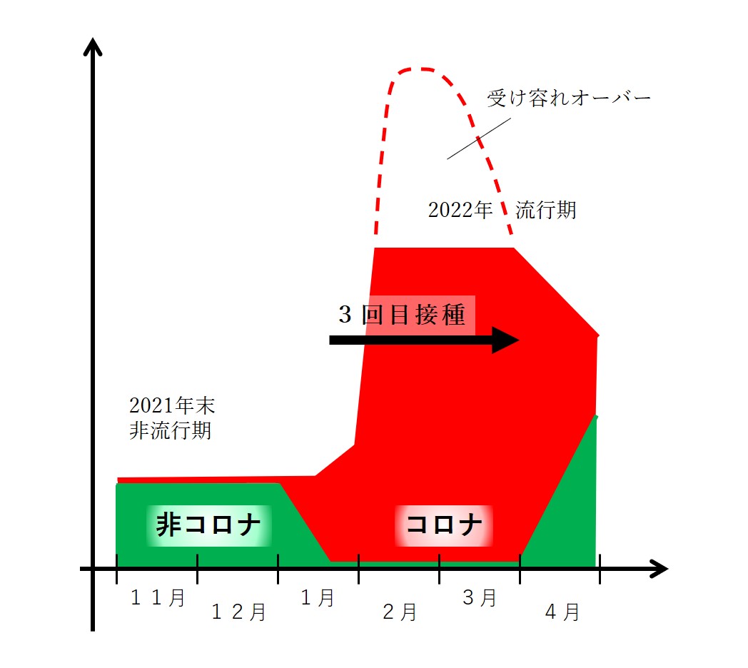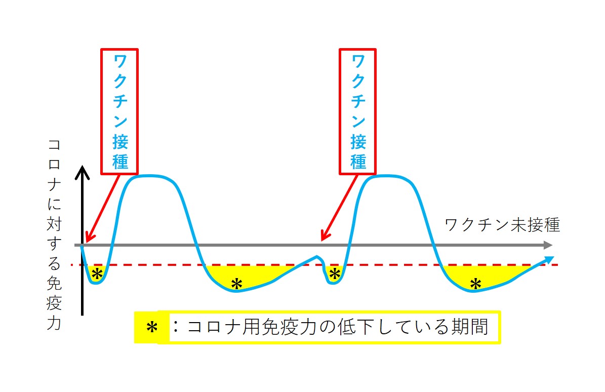 下図で示すように、コロナ用の免疫力が低下している時期と流行の時期(診察患者が増える)が重なれば、感染を避けることは困難でしょう。