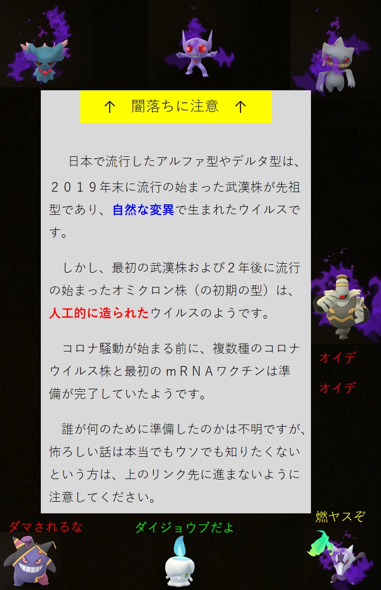 「新型コロナ」=「人工ウイルス説」にもとづく考察の本流は、補足説明2の考察」→「補足説明3」→「補足説明4」→「補足説明6」となっています。