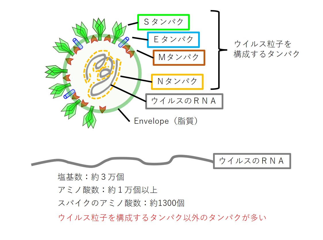 ウイルス粒子を構成するタンパク全種類(S, N, E, M)を合わせても、全体の4分の1くらいです。