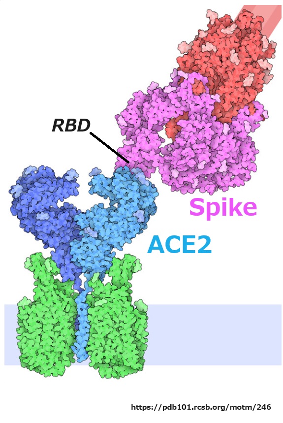 「S1」の先端近くに RBD (受容体結合部位)があり、ヒトの細胞膜表面にある ACE2 (エース・ツー)という受容体に結合します。