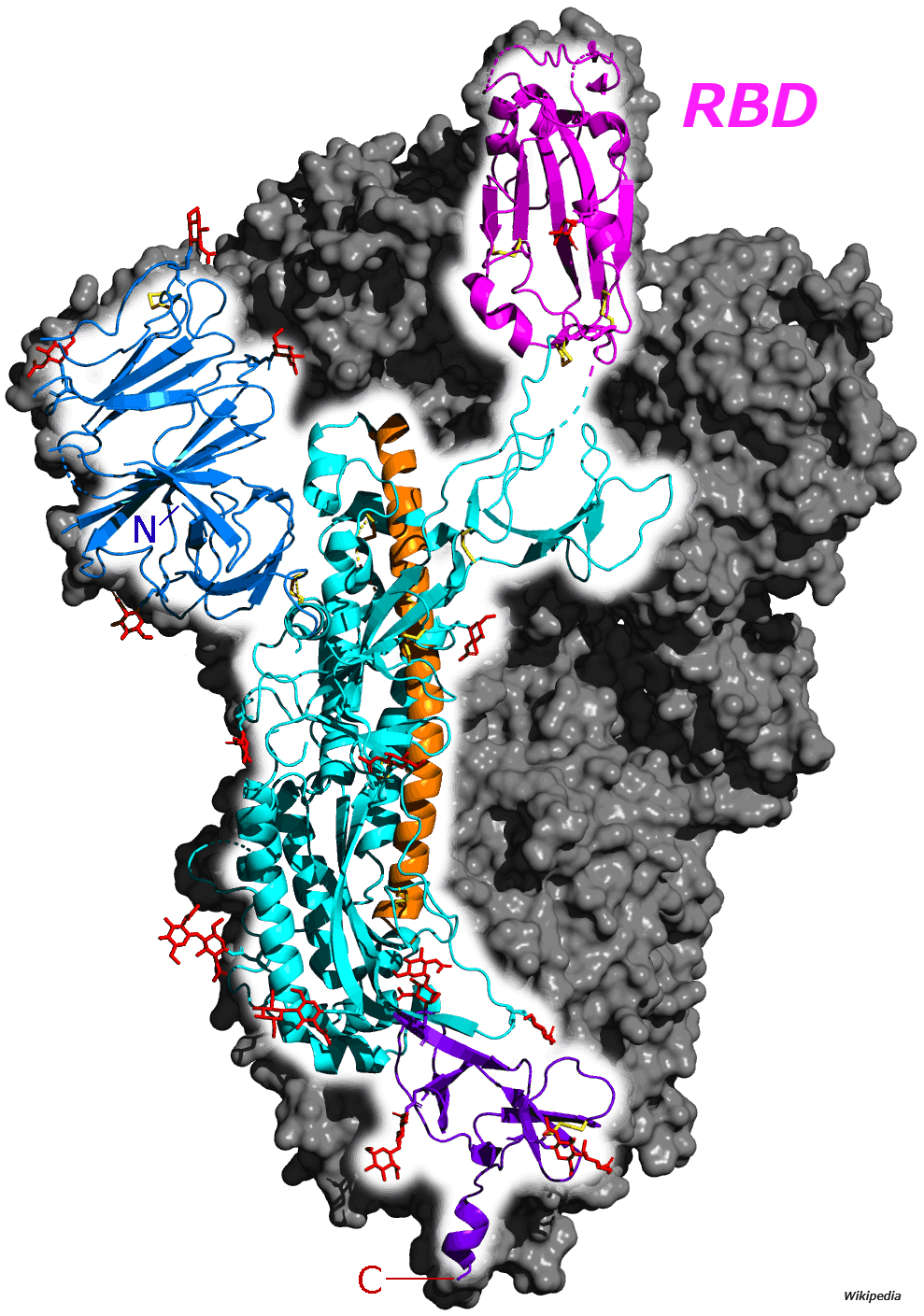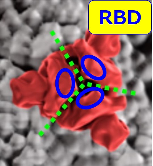 RBD(受容体結合部位)は、スパイク三量体の中央部分に位置し、ダウン型構造では半分隠れていて、アップ型構造になると外に突き出てくるようです。