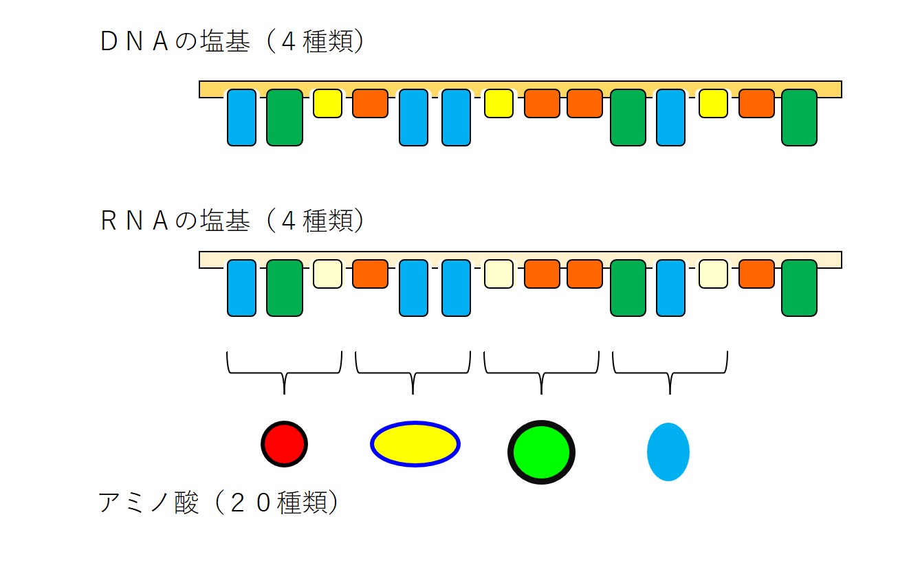 遺伝情報はDNAやRNAの4種類の塩基配列によって保持されたり伝達されたりします。その際、塩基3個がアミノ酸1個の情報を持ちます。