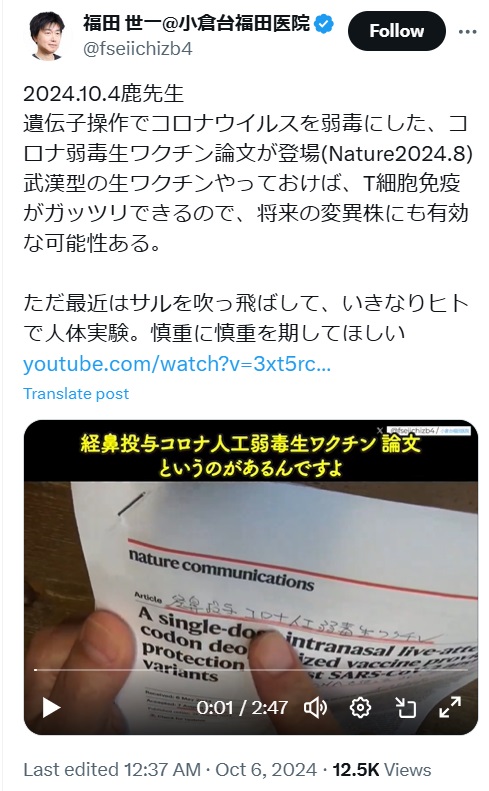 — 福田 世一@小倉台福田医院 (@fseiichizb4) October 5, 2024