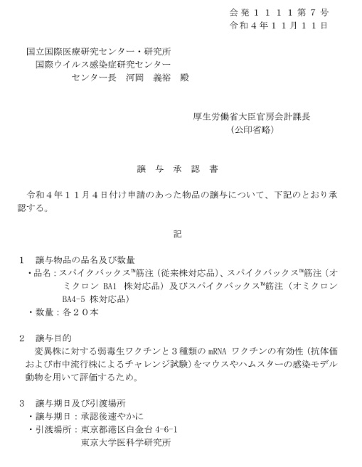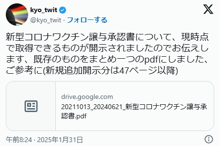 新型コロナワクチン譲与承認書について、現時点で取得できるものが開示されましたのでお伝えします、既存のものをまとめ一つのpdfにしました、ご参考に(新規追加開示分は47ページ以降)https://t.co/istexCPqWF