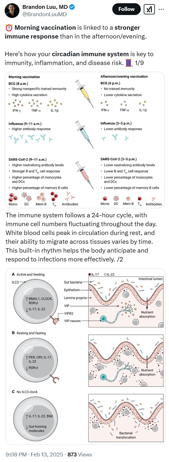 中身を詳しく見ていないのですが、BCG、インフルエンザワクチン、コロナワクチンなどは午後に接種するよりも午前中に接種した方が、免疫系の応答が大きくなるという研究結果が発表されています。