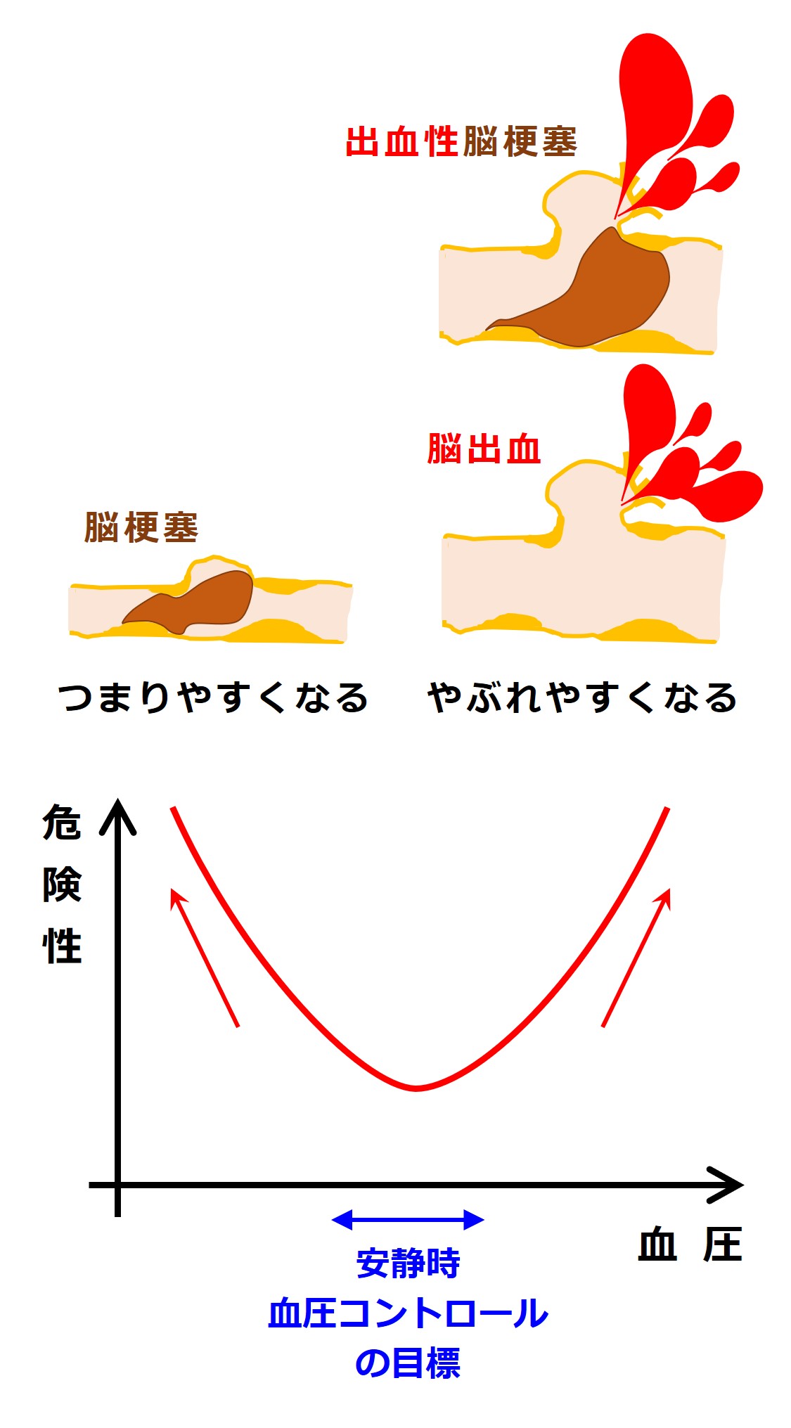主に、高血圧は「血管が破れる(→脳出血)」危険性を大きくし、低血圧は「血管が塞がる(→脳梗塞)」危険性を大きくしますが、高血圧は血管の動脈硬化を進行させるので脳梗塞の危険性も大きくします。