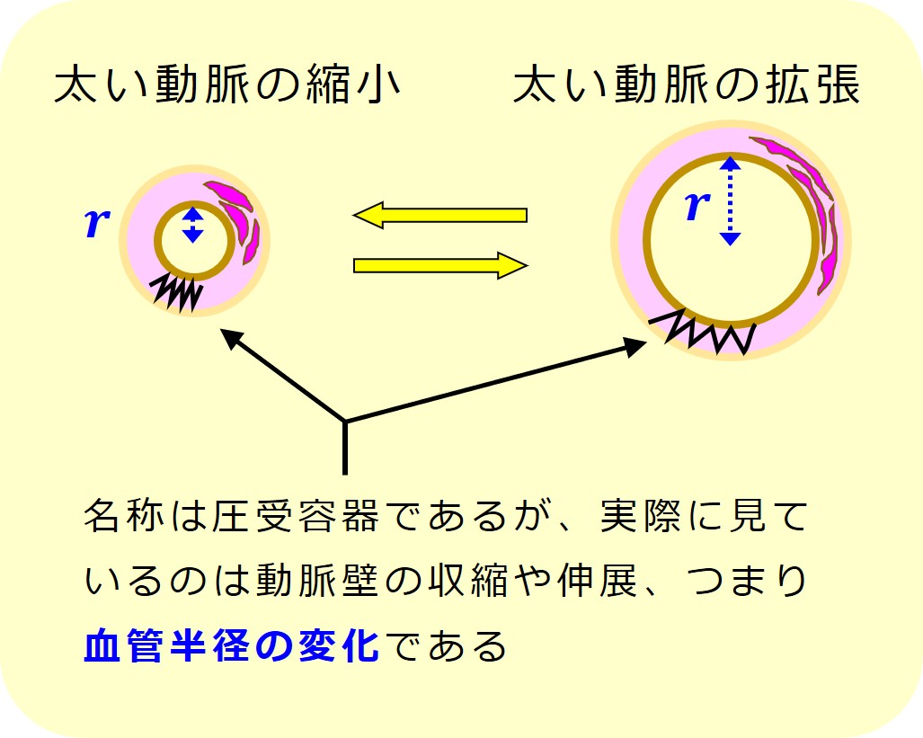 図はイメージなので大袈裟に描いていますが、心臓の拡張期・収縮期における大動脈の径の変化は 10 ~ 15 % 程度のようです。 末梢の細い動脈の半径は最大で4倍くらいの幅で変化できるようです。血管半径の変化は太い動脈よりも細い動脈で重要になります。