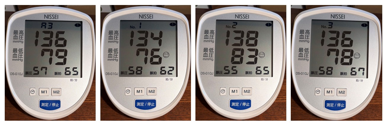 次図は、左から「3回平均、直前の測定値(X回目)、その一つ前の測定値、もう一つ前の測定値」です(ボタンを押すことで表示が切り替わります)。
