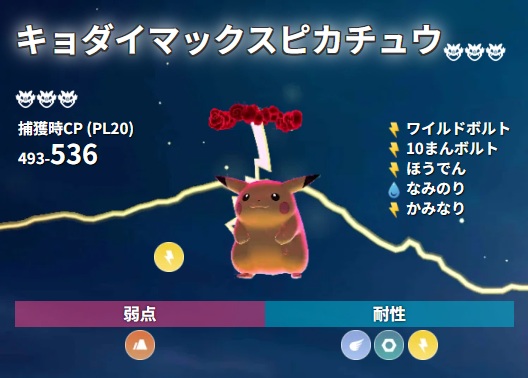 検索条件「キョダイマックスピカチュウ、すべての技構成(レガシーを除く)、PL40、マックス技Lv最大のみ」:▶ ▶ ▶