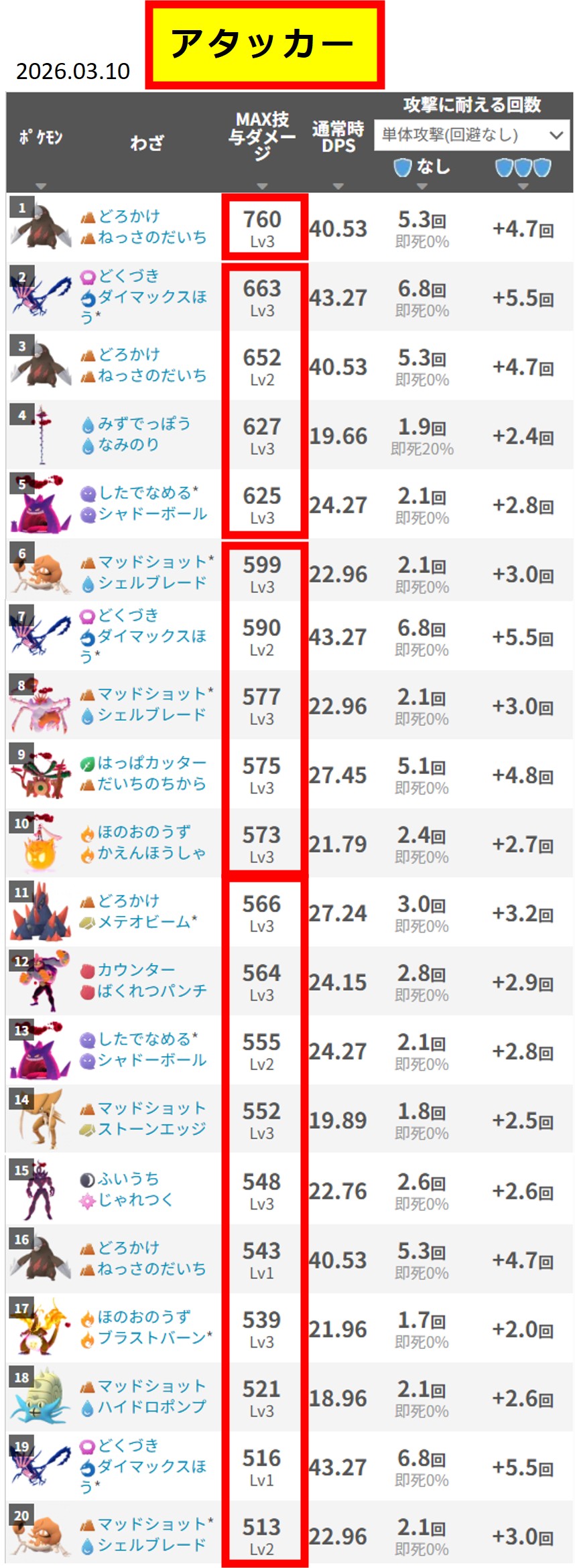 「みんポケ」さんの「マックスバトルタイプ別最強アタッカー一覧:▶ ▶ ▶」(2025.06.04)いくつか条件によっては最強が入れ替わりますので、記事で確認しましょう。