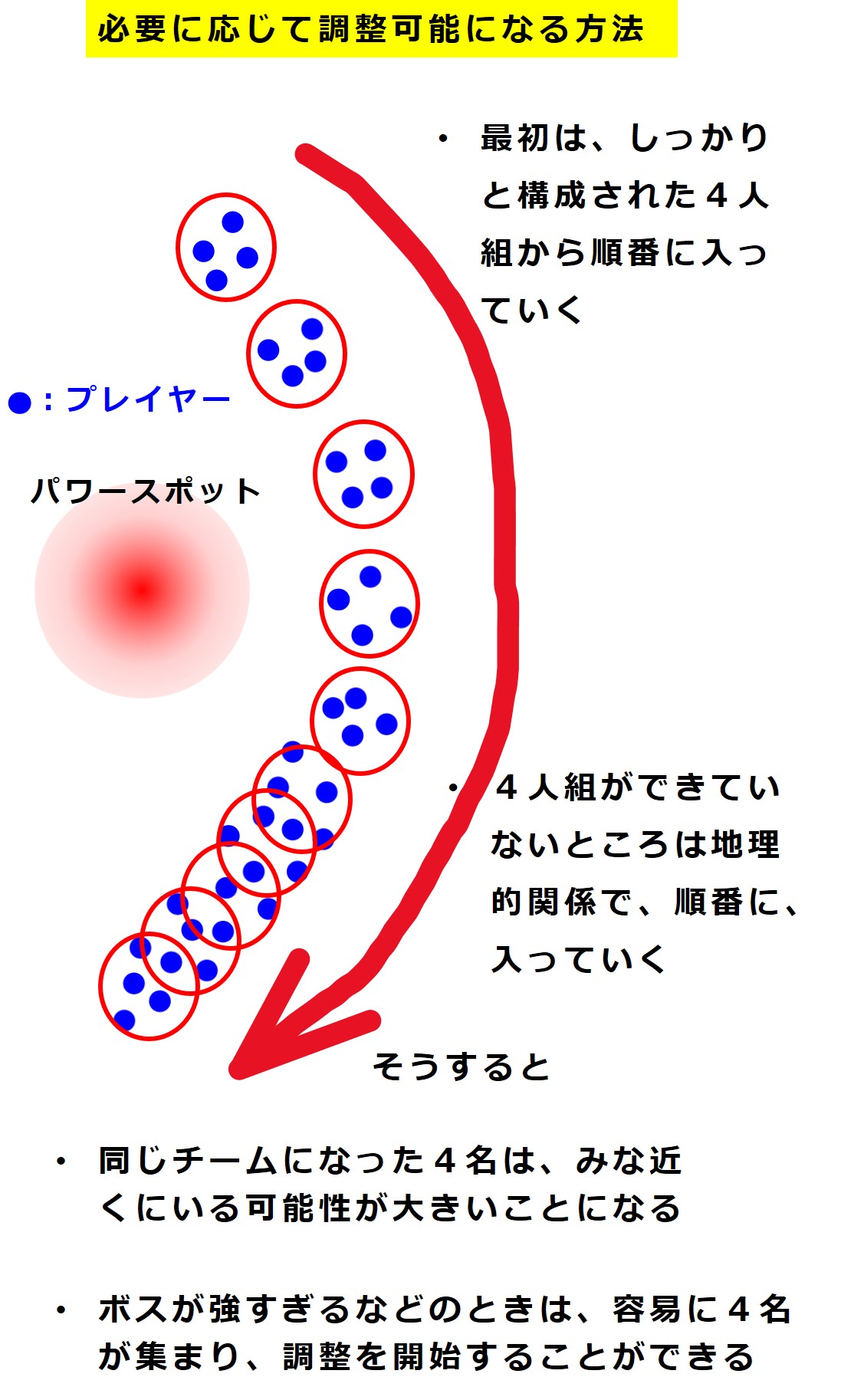 08/23(土曜)当日、4人バトルの場合は次のようにして4人グループを作ることになると思います(まだ予想レベルの話です)。こうすれば、強いトレーナーも弱いトレーナーも、みんなムゲンダイナを倒せるかもしれません。