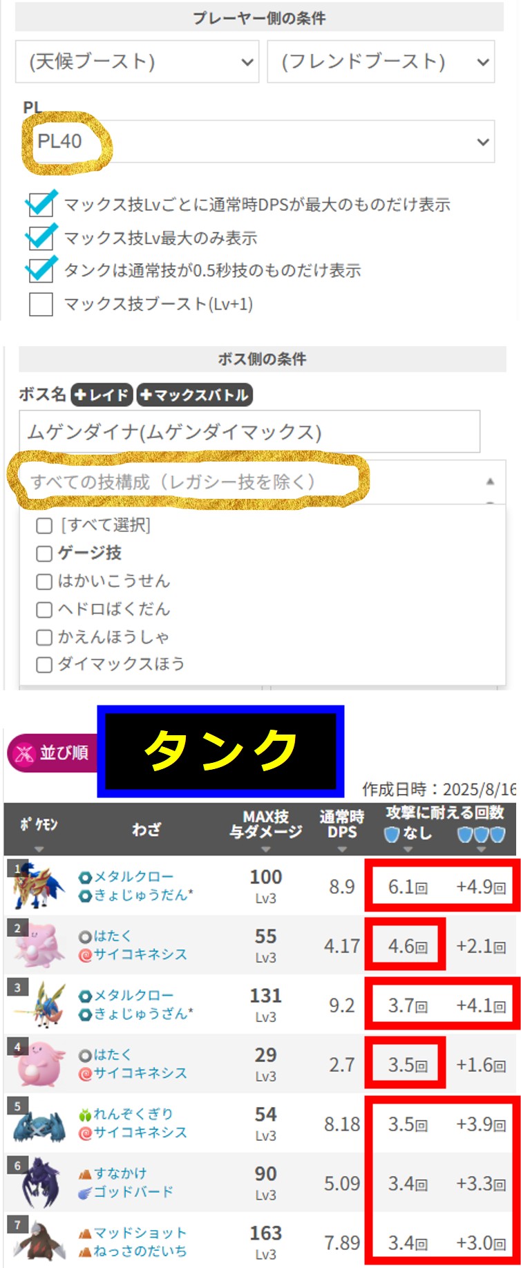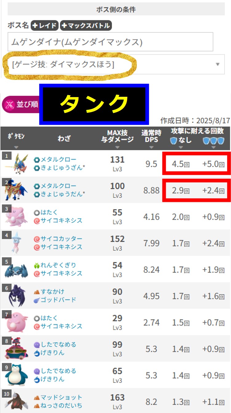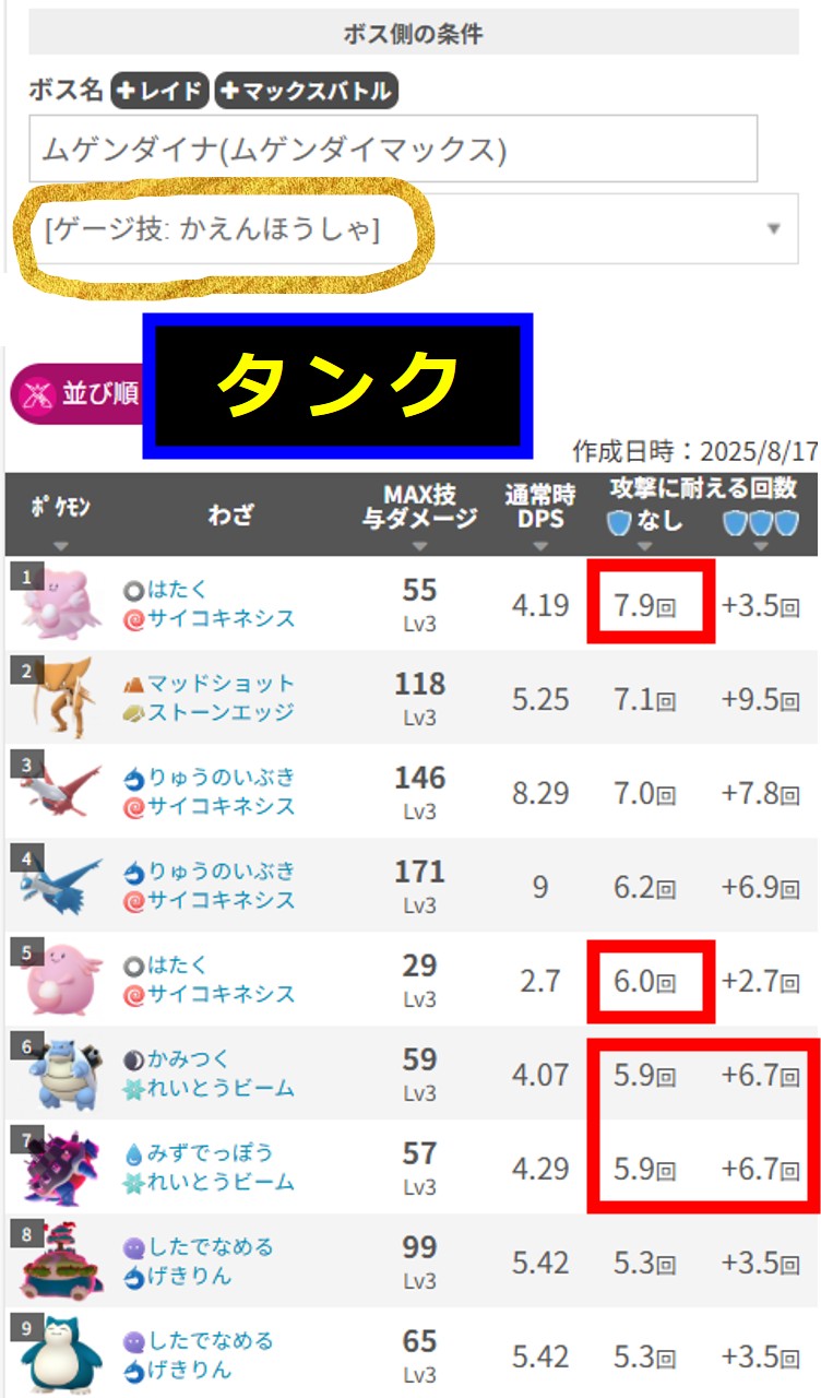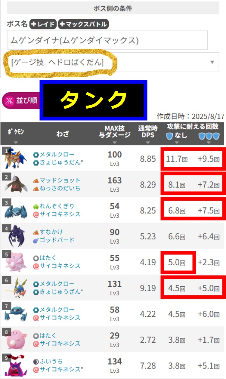 「みんポケ」さんの「マックスバトルタイプ別最強タンク一覧:▶ ▶ ▶」(2025.06.10)いくつか条件によっては最強が入れ替わりますので、記事で確認しましょう。