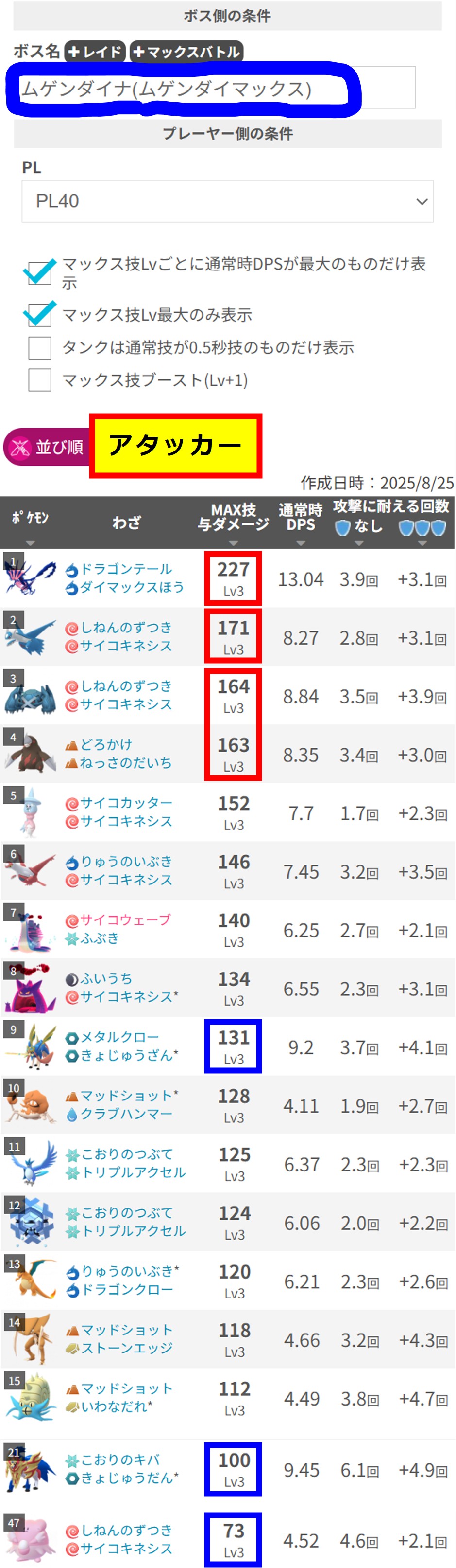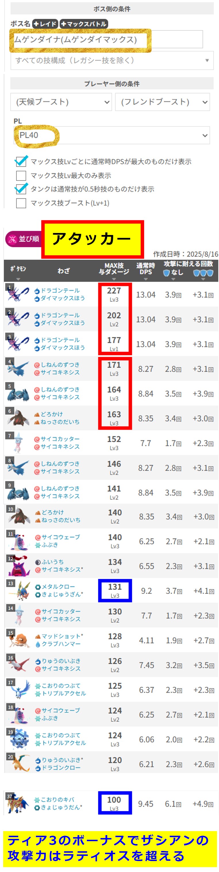 | PL | MxLv | ムゲンダイナ | ラティオス | メタグロス | ドリュウズ | ザシアン |