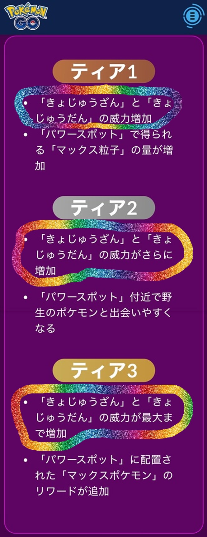 ポイントが 10 貯まるとランクが 1 あがります。毎日のポイント入手には最大 50 ポイントの上限があります。毎日コツコツ遊んで、ランクを上げていきましょう。目標は「ティア3」です。08/23土曜にはポイント受け取りの上限がなくなり、ムゲンダイナを入手して「ティア3」に到達できるようになります。